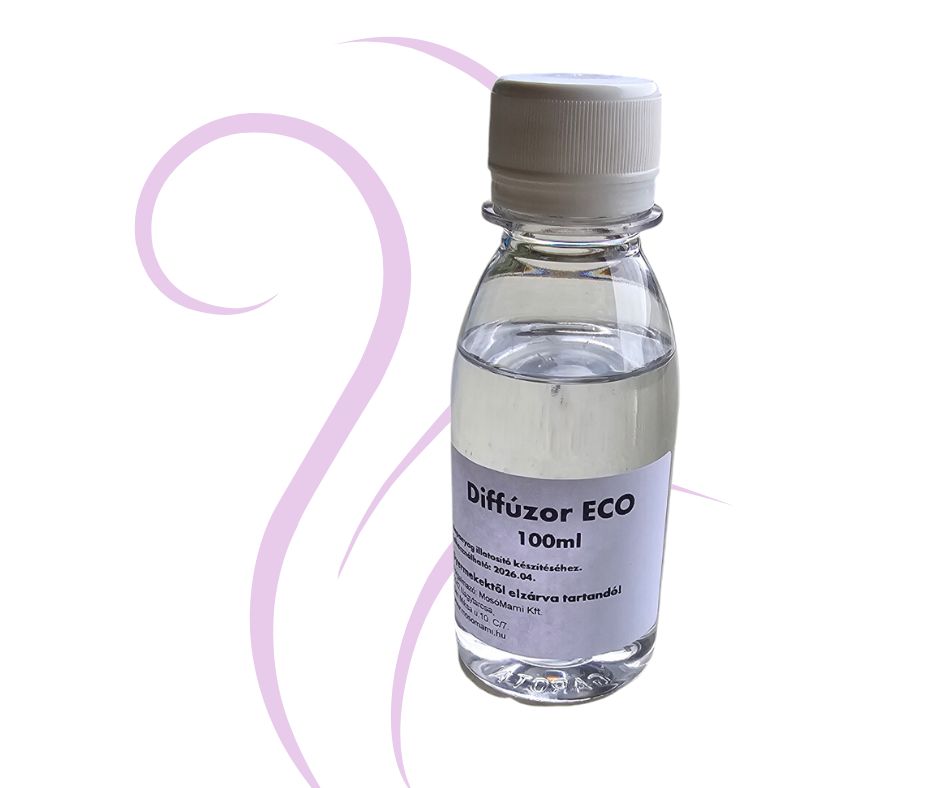 Diffúzor alap ECO 100ml: növényi alapú és biológiailag jól lebomló oldószer kifejezetten parfümipari célokra, elsősorban diffúzor és egyéb illatosítók készítéséhez. Jól eloszlatja az illatanyagot, segíti az egyenletes párolgást, hosszú ideig elegendő egy-egy helyiségben.